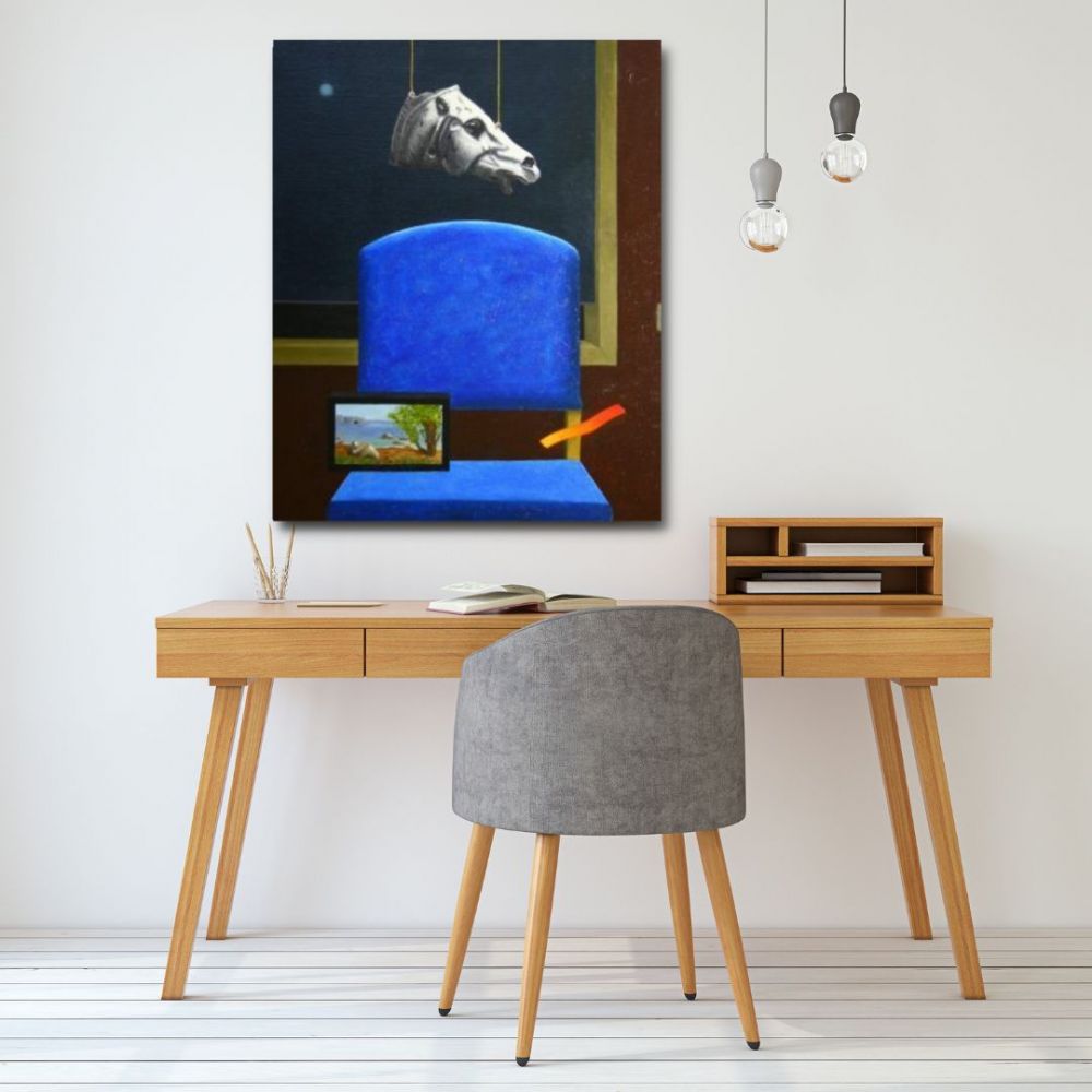 Inspirationskilderne til Nyströms maleri er vidtfavnende og spænder fra barokmaleri til litteratur og film noir, og flere af hans værker rummer intertekstuelle og visuelle referencer til kunst- og kulturhistorien. I maleriet Chair ses centralt placeret en stol med blåt betræk hvorover et antikt hvidt gipshestehoved hænger, tøjret i reb og delvist omkranset af en mørklagt vinduesramme. Stolen fungerer nærmest som staffeli, hvorpå et landskabsmaleri i minatureformat er placeret i dette lettere absurde, men stringent iscenesatte tableau. De mystiske, mennesketomme rum er karakteristisk for Nyströms gådefulde malerier, der har en surreel undertone og en evne til at desorientere os i det ellers umiddelbart velkendte. Mennesket er så at sige usynligt tilstedeværende i kraft af symbolske rekvisitter og efterladte artefakter og de tomme interiører aftegner sig arkæologisk som lag af tegn. Hans malertekniske arbejde med lys og skygge, det oplyste og det hengemte, er inspireret af den klassiske clair obscure-teknik, hvor lys og mørke forenes til et samlet hele, og hvor han suverænt bestemmer, hvad der hengemmes i det dunkle.