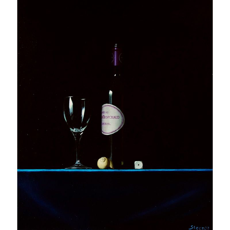 På sort baggrund ses fire genstande direkte forfra. De står på en tynd blå hylde eller en glashylde. Opstillingen består af en vinflaske og et vinglas begge med lysreflekser samt en konkylie og en terning. Genren er stilleben og både den og den hyperrealistiske malestil trækker tråde til 1600-tallets oliemaleri, hvor kunstnere vha 'trompe l'æil' forsøgte at gøre det umuligt for øjet at skelne mellem maleri og virkelighed. I tråd med den gamle tradition har Steen benyttet sig af vanitassymboler, dvs genstande der skal minde os om livets flygtighed eller forgængelighed. Her er det flasken og glasset, som er fremstillet af et skrøbeligt materiale, der kan splintres på et øjeblik. Steen bringer det ind i nutiden gennem sin strengt minimalistiske komposition med den sorte baggrund. Han ser sine genstande som sammensatte af geometriske former (ligesom kubisterne), og starter sit arbejde med at skitsere disse geometriske former på lærredet, inden selve maleprocessen begynder. Alt handler for ham om komposition. Han søger altid den perfekte balance i sin komposition. Han har kaldt det "the geometry of painting".