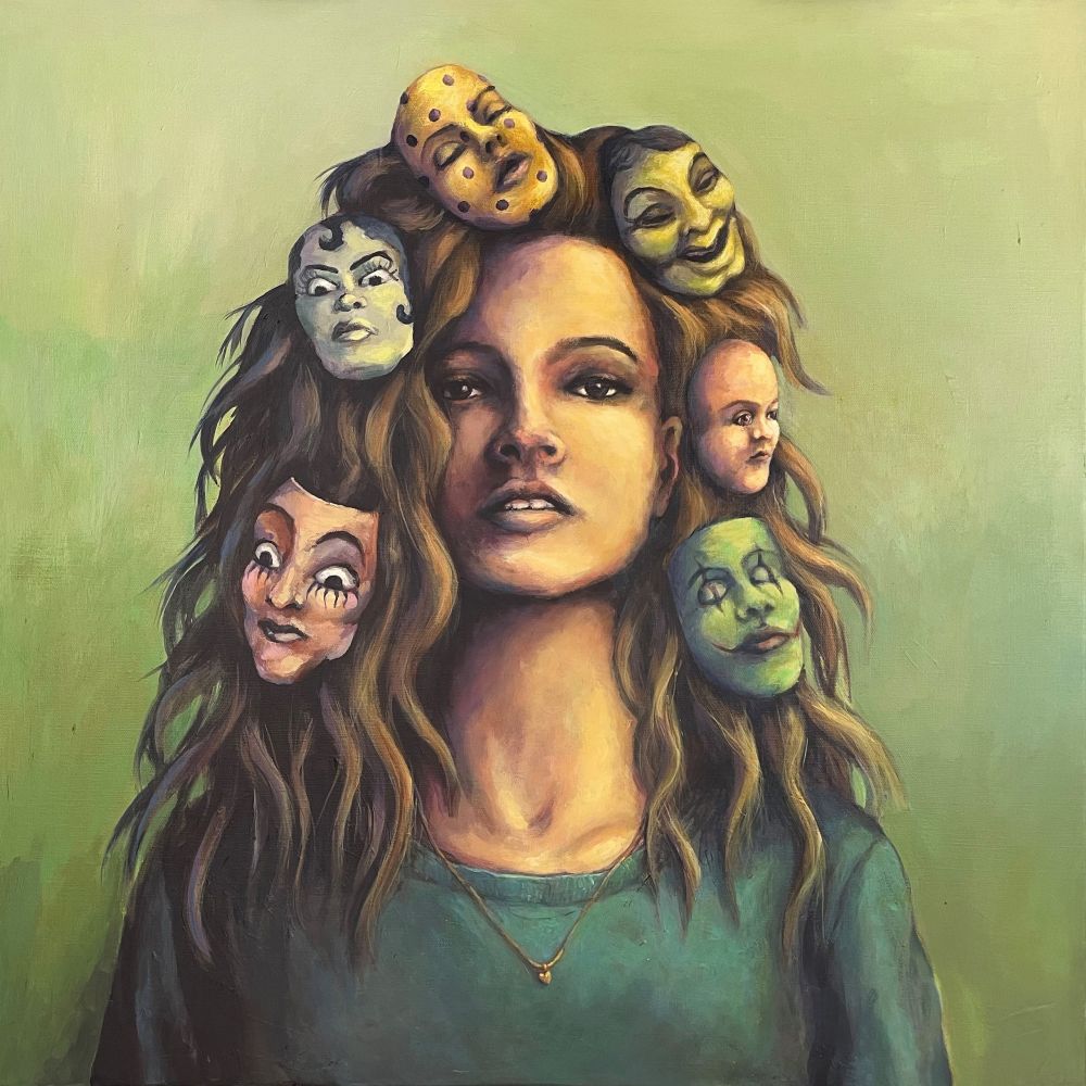 På en lys grøn baggrund ser vi en ung kvinde direkte forfra. Hun har udslået, rødgyldent hår og bærer en blå bluse samt en guldkæde med et lille hjerte. Fastgjort i håret er seks masker med meget forskelligt udtryk. Nogle er stærkt ekspressive og udtrykker fx følelser som vrede eller skræk. Farvetonerne i baggrunden, tøjet og kvinden selv går igen i maskerne og indikerer, at der er en sammenhæng mellem kvinden og maskerne. Jaeger kalder sin stil for magisk realisme, en stilart der opstod for omkring hundrede år siden i kølvandet på surrealismen, og som blander en realistisk, genkendelig virkelighed med overnaturlige eller surrealistisk elementer. Det er sjældent, at voksne blotter sig helt. Vi har alle vores facade eller masker i mødet med omverdenen. Kvinden her har mange masker, men er fanget i et nøgent, sårbart øjeblik. Unmasked.